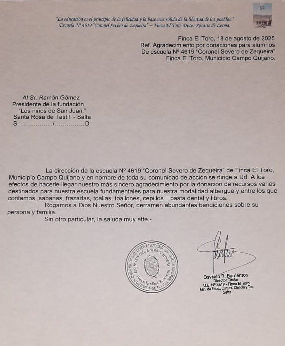 Llegamos hasta la Escuela N.° 4619 “Coronel Severo de Zequeira”, ubicada en Finca El Toro, Municipio de Campo Quijano, para entregar ropa de cama y elementos de higiene a los niños y niñas que se albergan allí de lunes a viernes.